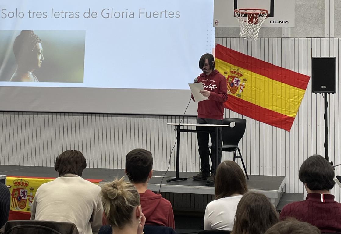 Es war wieder einiges geboten beim dritten Vorlesewettbewerb Spanisch an der FOS II in Nürnberg. 11 Schülerinnen und Schüler aus ganz Nordbayern hatten sich vorab als Vertreter für ihre Schulen qualifiziert. In der ersten Runde lasen alle Teilnehmer einen aus drei bekannten Zungenbrechern vor. Unser Kandidat aus Hof, Kevin Gérecz, überzeugte und schaffte es in die zweite Runde, in der das Gedicht „Solo Tres Letras“ (Nur drei Buchstaben) von Gloria Fuertes vorgetragen wurde. In der letzten Runde lasen die drei Finalisten einen Auszug aus dem berühmten Märchen „Blancanieves“ (Schneewittchen und die sieben Zwerge) und begeisterten unter anderem mit der Imitation von sieben verschiedenen Stimmen – und das auf Spanisch. Begleitet wurde die Veranstaltung von einem bunten Tapas-Buffet und stimmungsvoller Musik der Schul- und Lehrerband. Ein weiteres Highlight war der Flamenco-Workshop, bei dem alle Teilnehmer zu spanischer Musik gemeinsam eine Choreografie einstudierten. Wir freuen uns schon auf den nächsten Concurso de lectura 2026!
