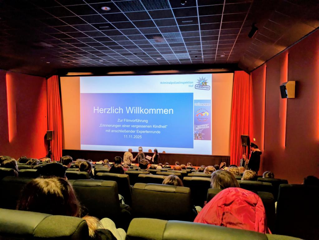 Am 11. November besuchten die beiden Vorklassen gemeinsam mit ihren Lehrkräften Frau Frantz, Herrn Roth, Herrn Egli und Frau Heinert eine Kinoveranstaltung im Central-Kino Hof. Initiiert wurde das Angebot von Stefanie Vollert, Suchtpräventionsbeamtin der Kriminalpolizeiinspektion Hof. Nach dem Einlass und einer kurzen Begrüßung startete gegen 9:00 Uhr der Kurzfilm „Erinnerungen einer vergessenen Kindheit“. Der Film zog von Anfang an die Aufmerksamkeit auf sich, sodass während und nach dem Film absolute Stille im Saal herrschte.