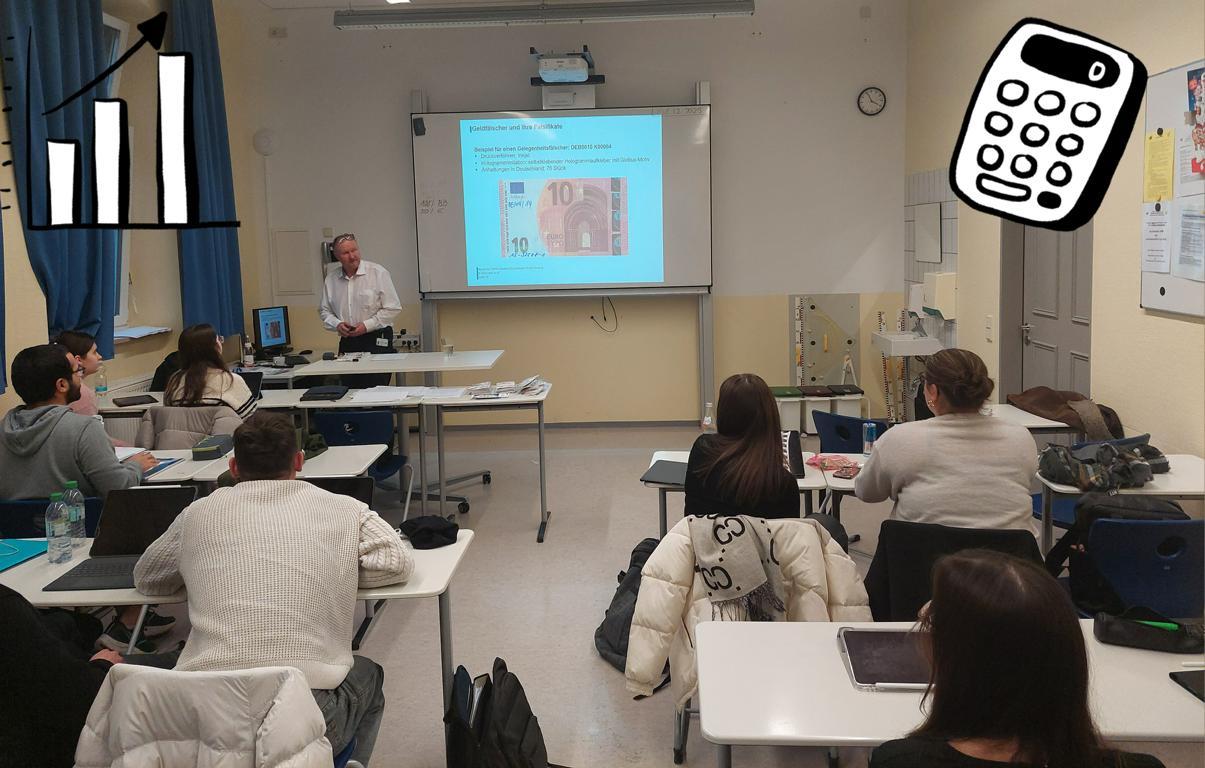 Die Klasse F12W der staatlichen FOSBOS Hof freute sich heute über einen spannenden Vortrag zu Falschgeld, Geldwesen und Bargeld in Deutschland. Referent Alexander Zwosta (links im Bild) informierte die Schülerinnen und Schüler unterhaltsam und mit Erfahrungen der Bundesbank Filiale in Nürnberg. Wir sehen die erfreuten Zuhörer im Unterricht von Herrn Karnitzschky (Organisator).